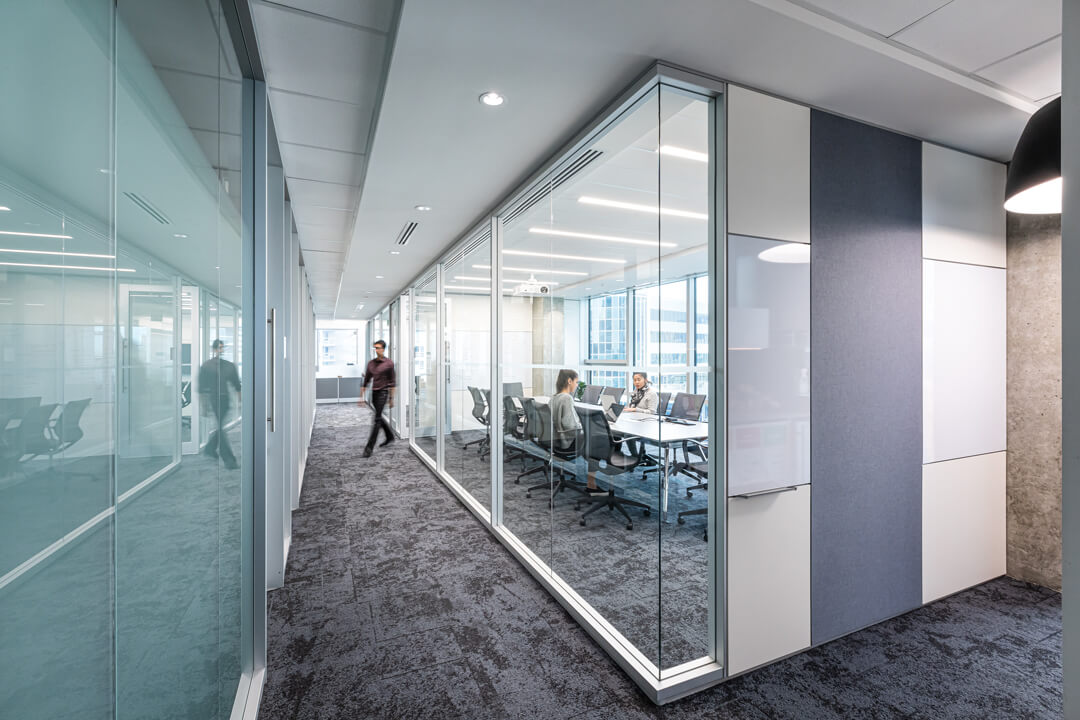 This 8-floor office tenant improvement, designed by SQ1 Interior Design, has a combination of enclosed offices as well as open workspaces and cubicles. There are also several meeting rooms, seating areas, and coffee stations for employees to congregate at.