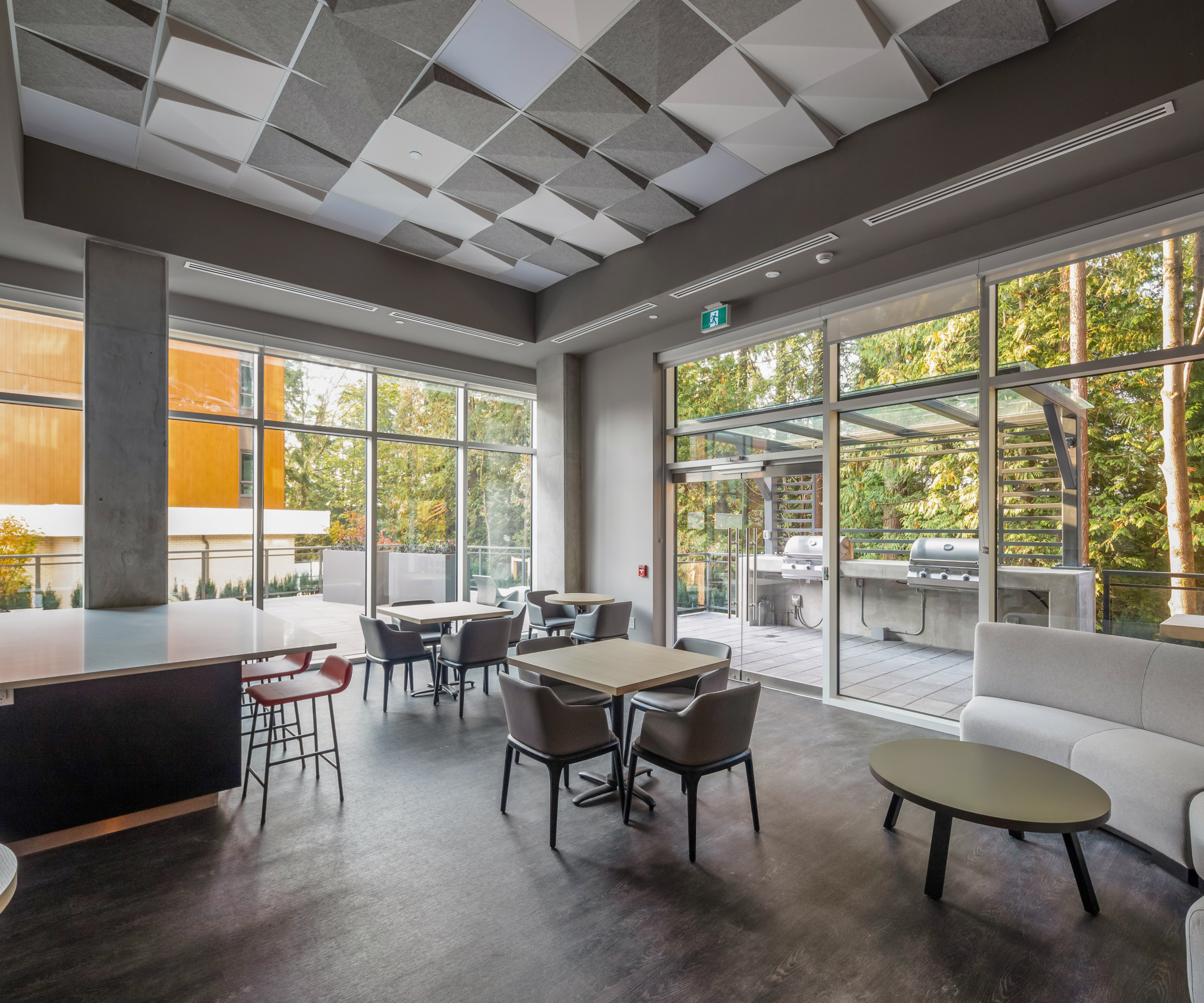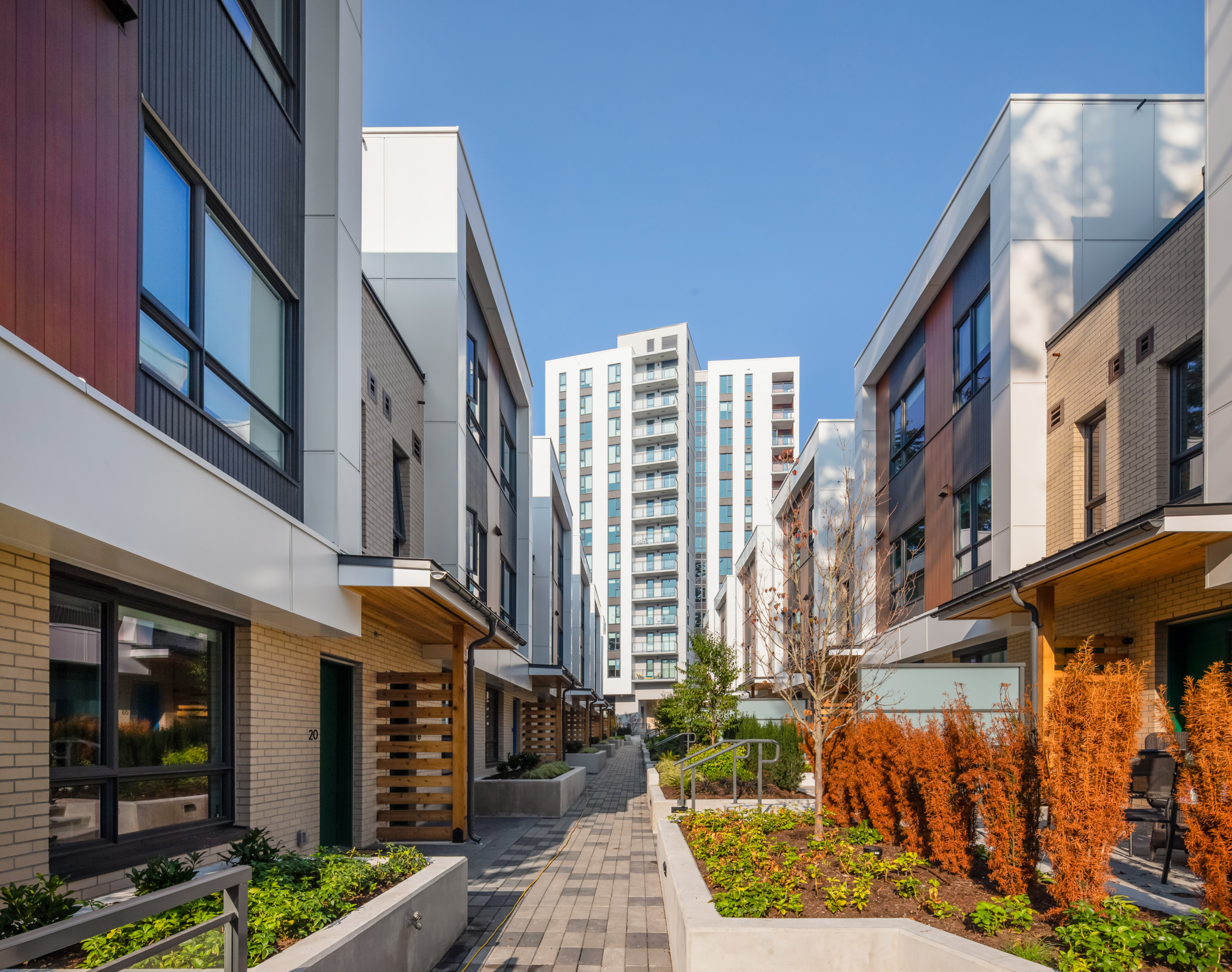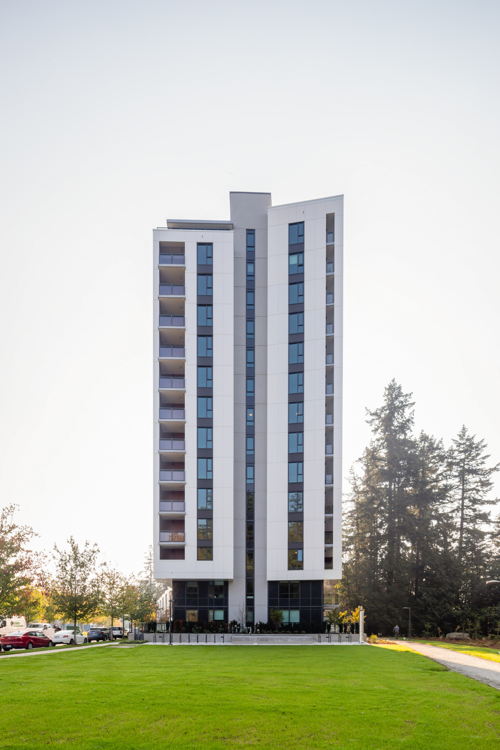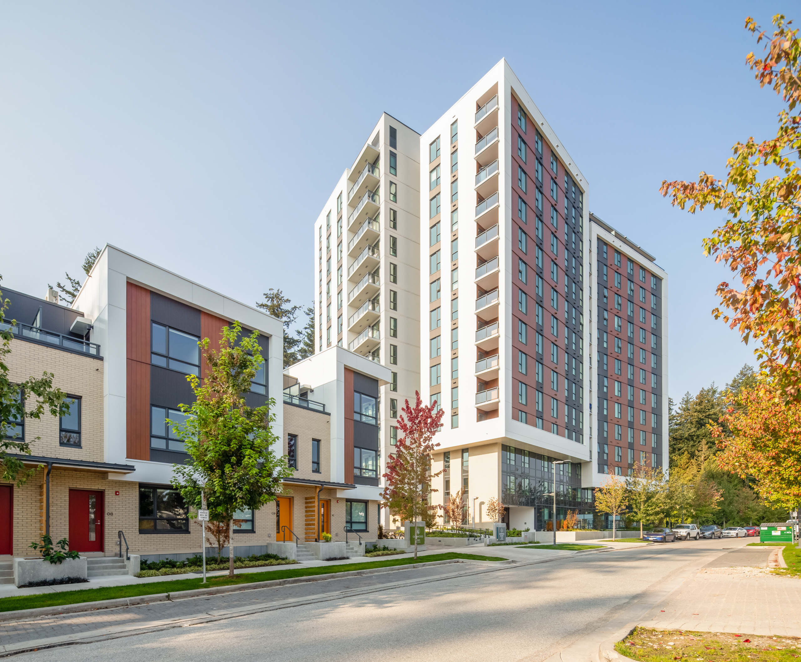 Designed by ZGF Architects, the development includes a concrete rental building and wood-frame purpose-built townhomes available exclusively to students, faculty, campus staff, and businesses located on the UBC campus.