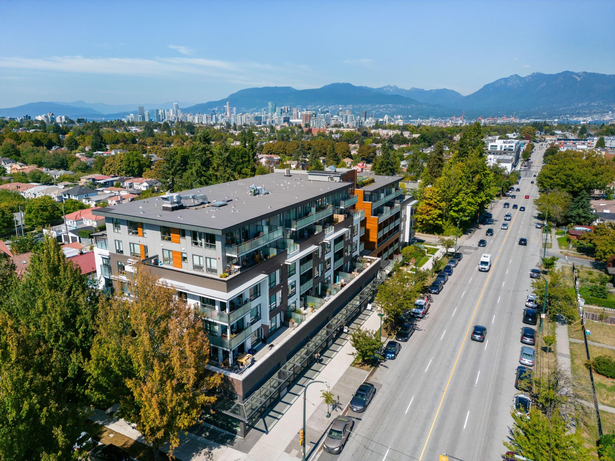The Fraser is a seven-storey, mixed-use wood-frame development that blends residential rental units with ground-floor commercial space.
